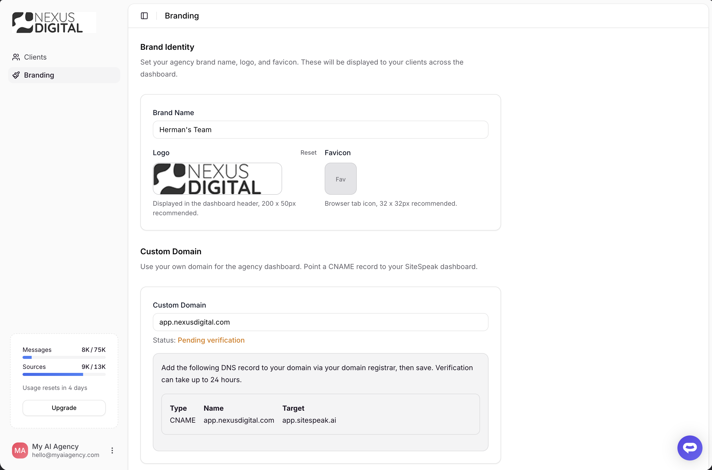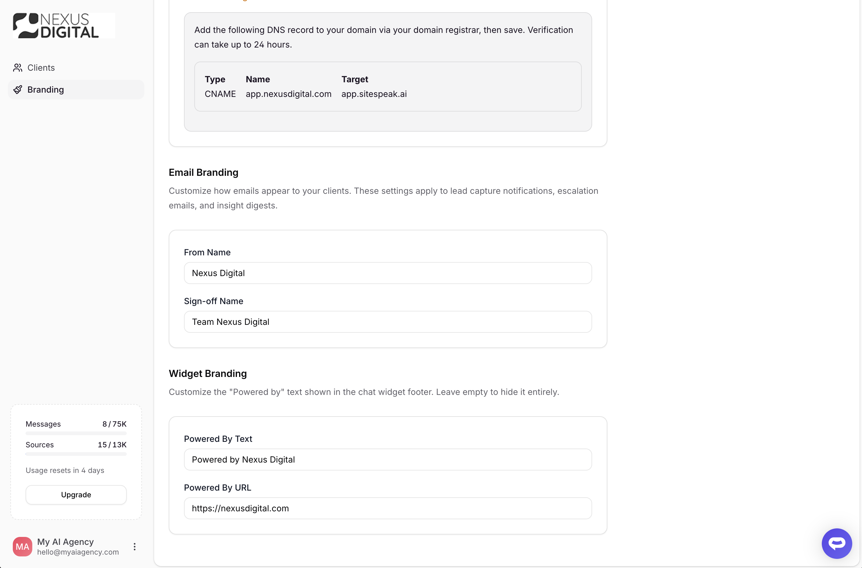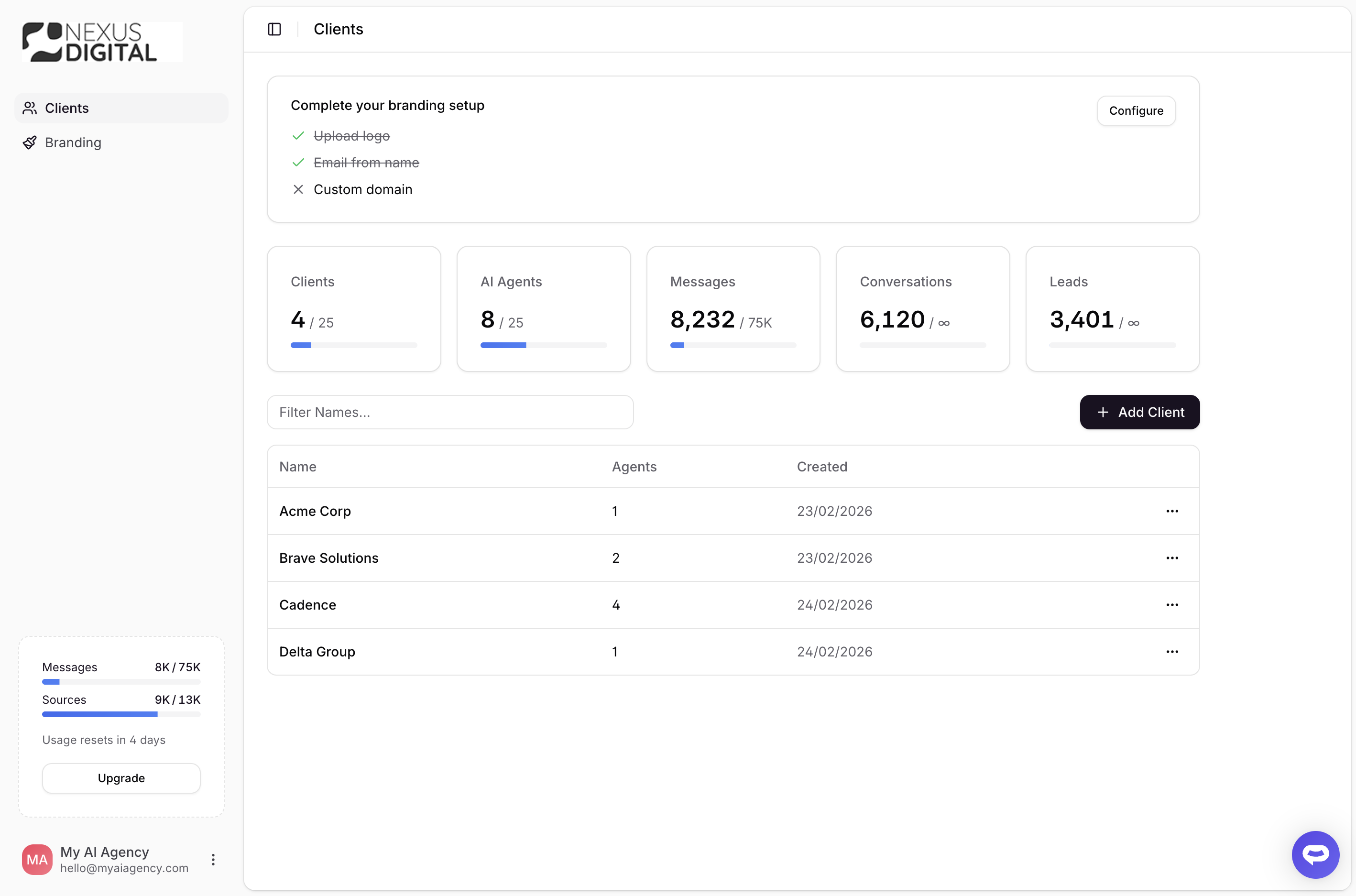Manage client chatbots under your own brand. Custom domains, branded emails, and a fully branded dashboard experience.