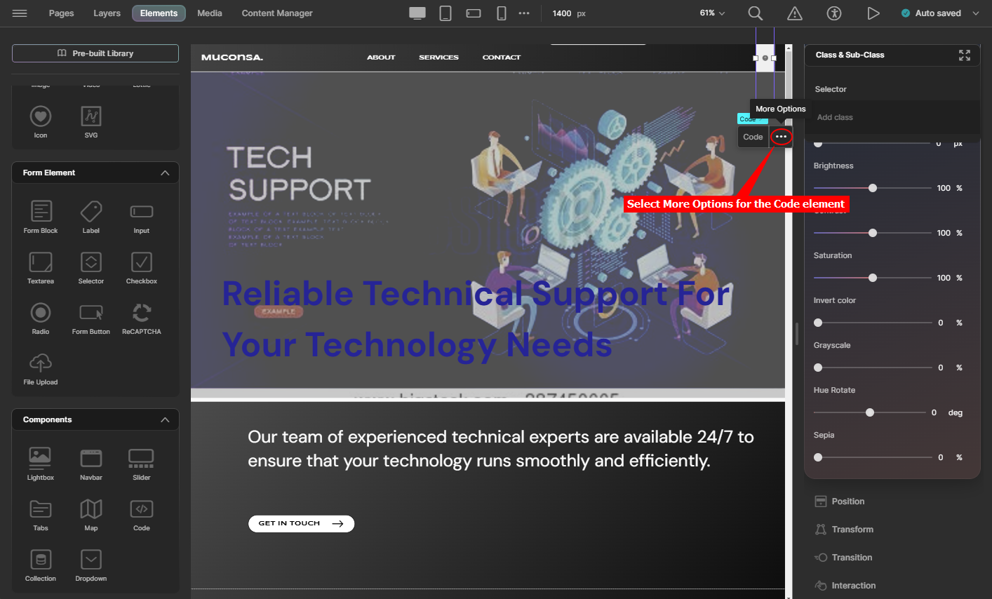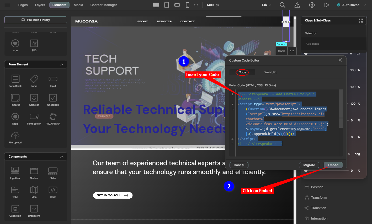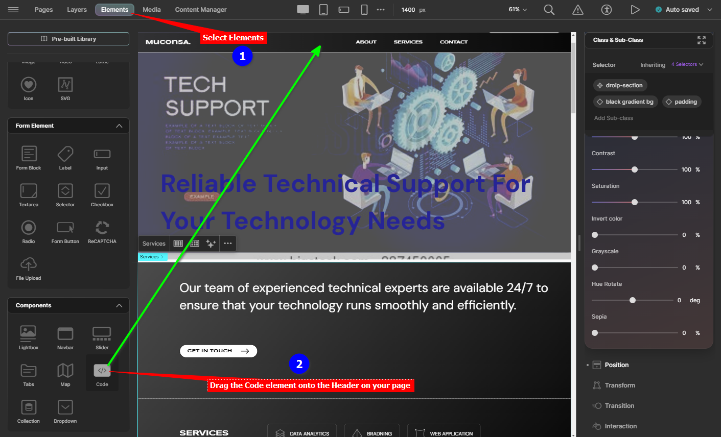 Select Elements on the top menu bar, scroll down to Components and drag the Code element onto the Header on your page