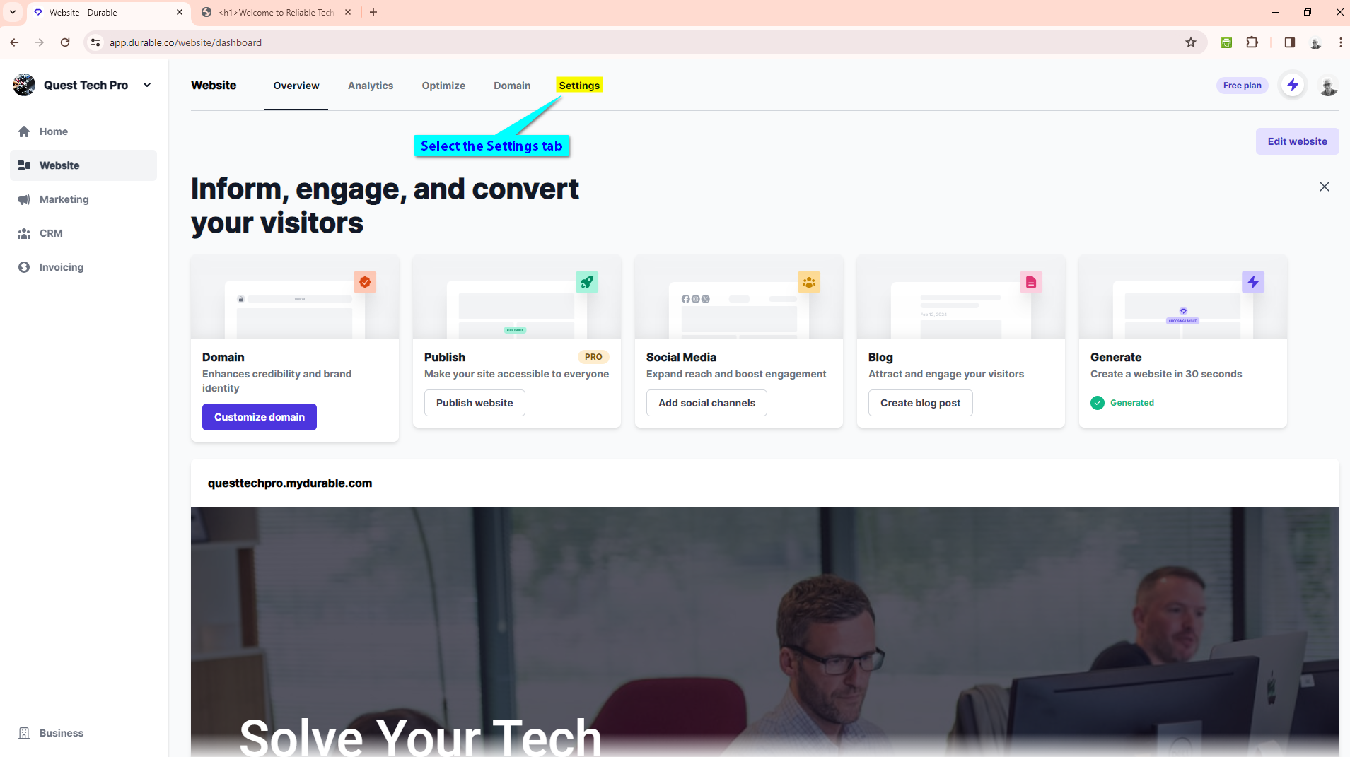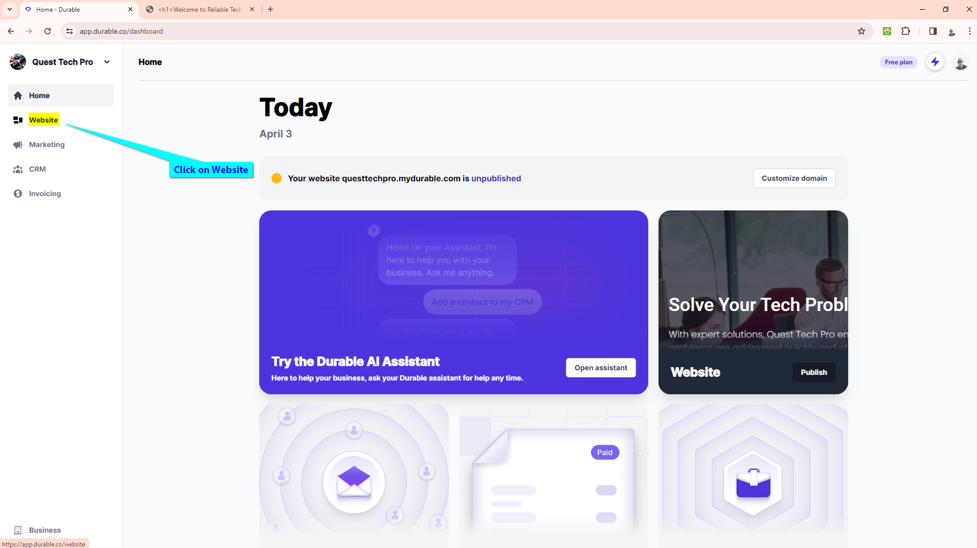Log in to your Durable website builder dashboard and select Website