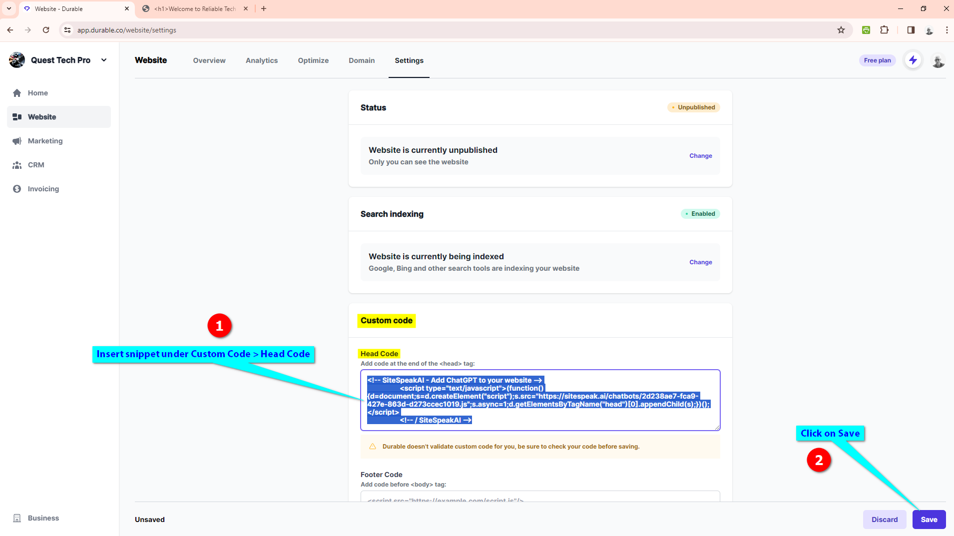 Insert your support agent snippet in the Head Code text input box under Custom code and click on Save to save the changes to your website