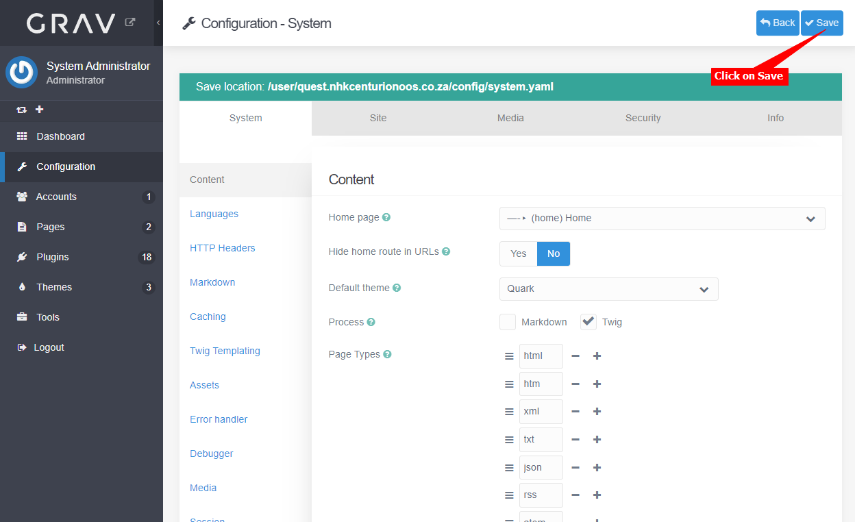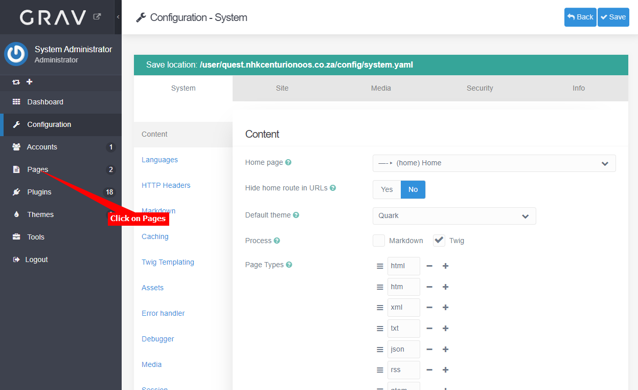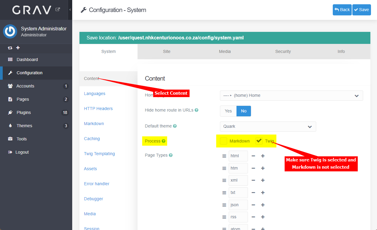 - Select Content on the System configuration list and under Process, make sure Twig is checked and Markdown is unchecked.