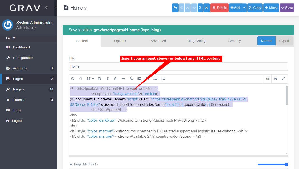 Add your AI support agent to your GRAV website