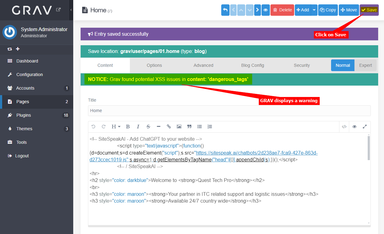 - Click on Save to save your input. GRAV will display a warning regarding potential XSS issues in content. This is due to the fact that the snippet contains a JS script tag. You can ignore this warning.