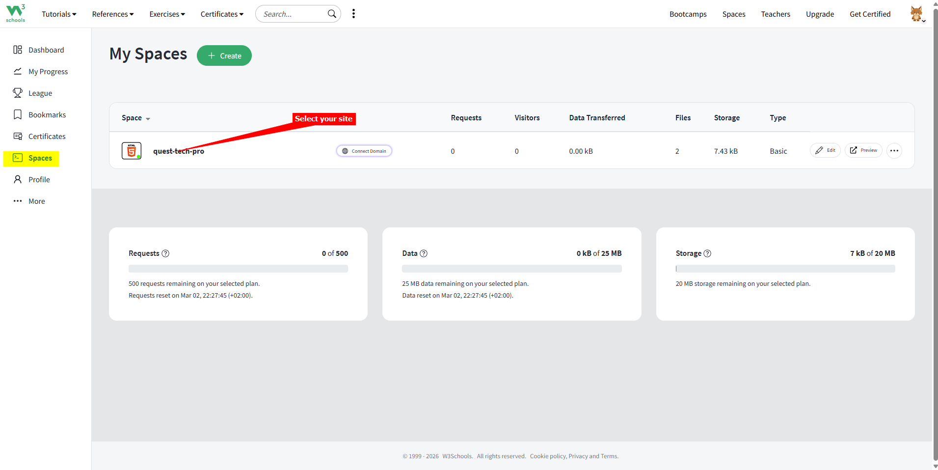 - Log into your W3Schools account, select Spaces on the dashboard and then select your website