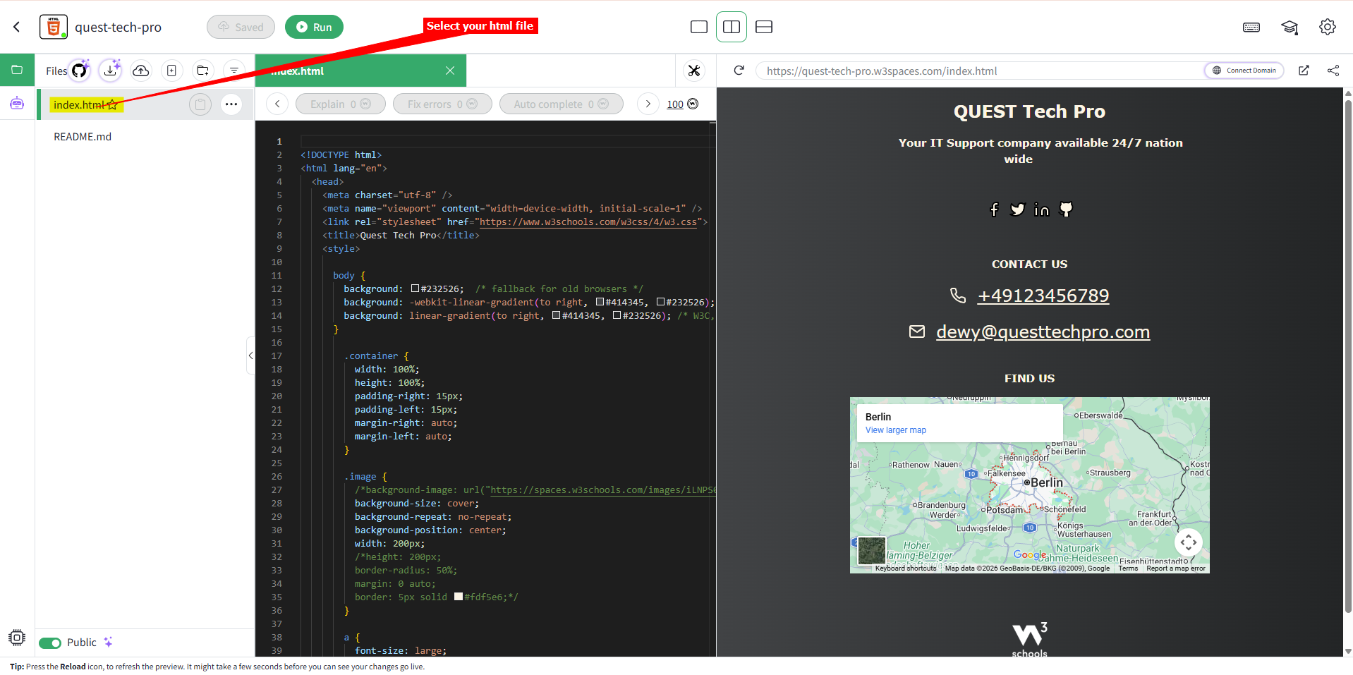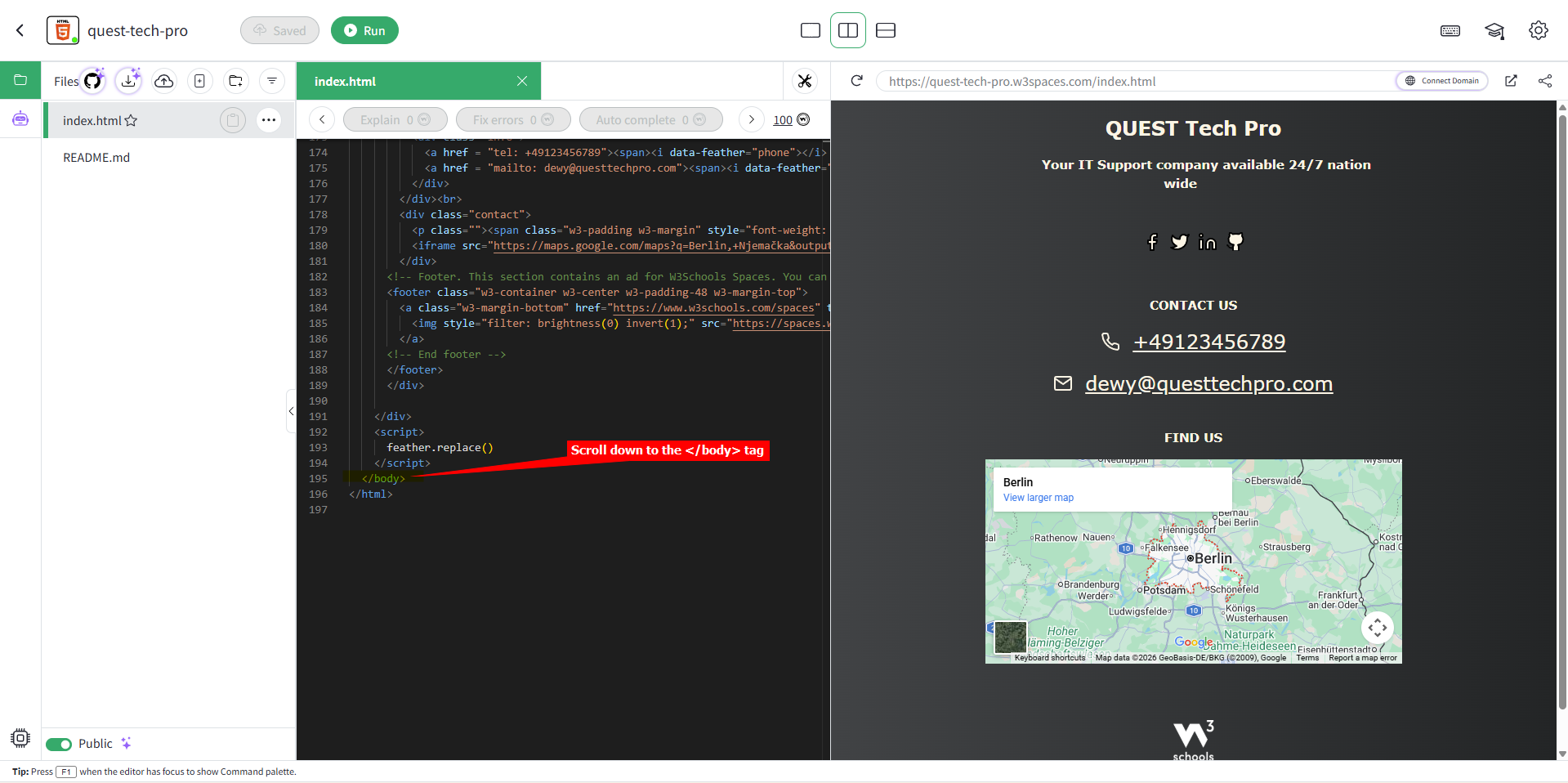 - You will now have a split display with the index.html code on the left pane and the webpage preview in the right pane. Scroll down in the left pane to just before the ending