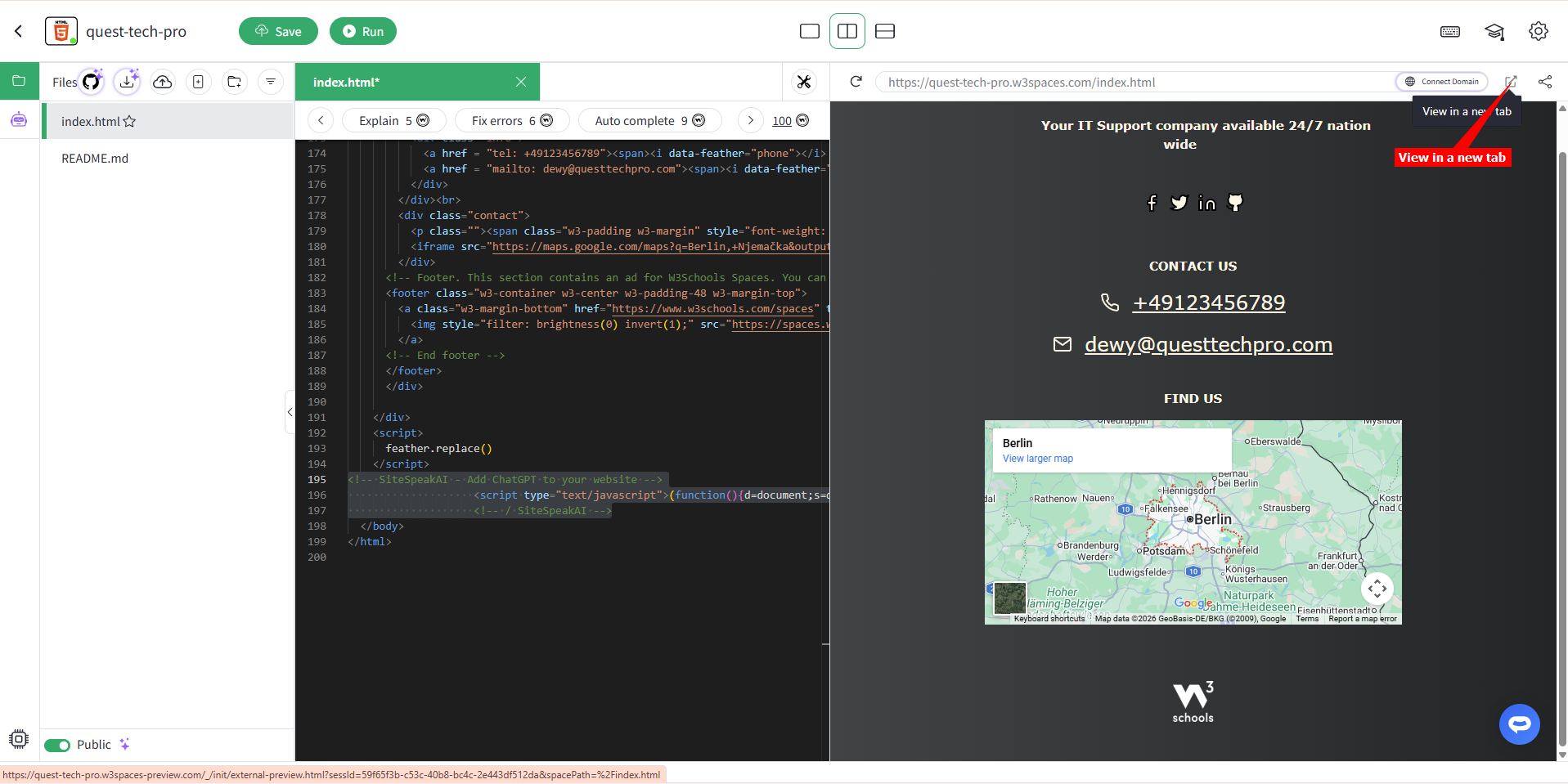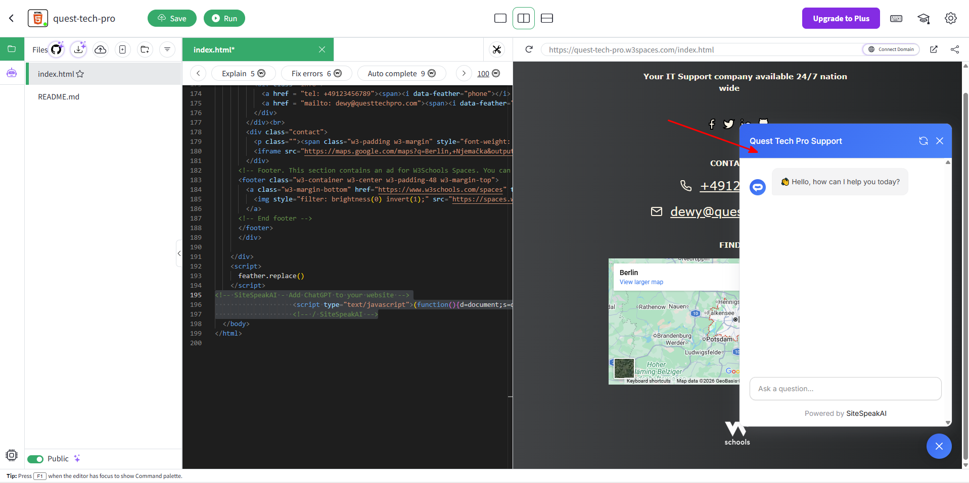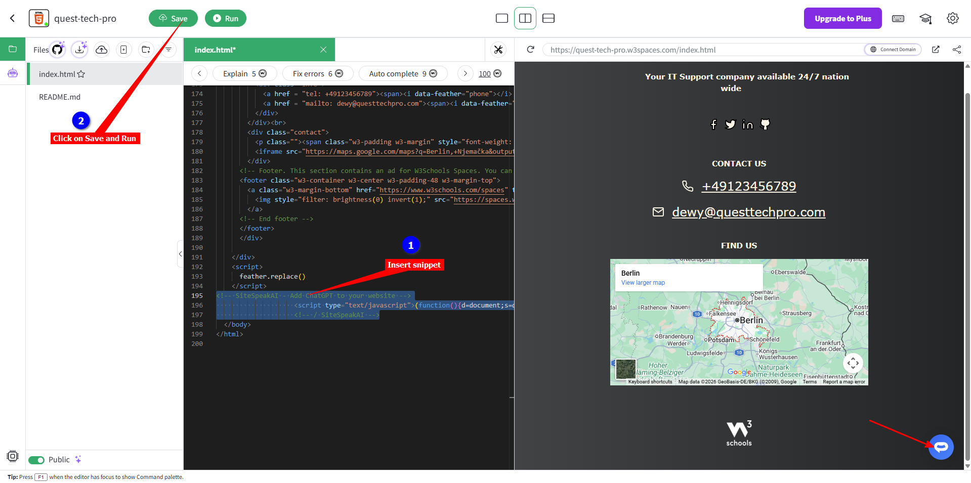 </body>tag and insert your AI support agent snippet. When done, click on Save and then on Run to see your changes in the preview pane. Your AI support button will appear on your page